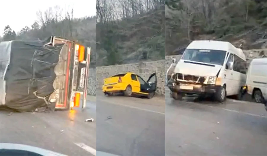 Kazada bir TIR devrilirken, servis minibüsü ile bir otomobil çarpıştı. Ticari taksi ve bazı otomobiller ise savrularak yol kenarındaki duvara çarptı.