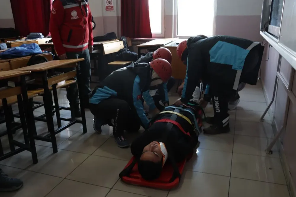 Düzenlenen tatbikatta senaryo gereği okulun üçüncü katında mahsur kalan bir yaralıya UMKE ekipleri yerinde ilk müdahale yaparak ambulansa ekiplerine teslim etti.