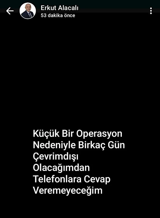Kozlu Belediye Başkan Yardımcısı Erkut Alacalı, WhatsApp durumundan sağlık durumuyla ilgili yaptığı paylaşımda; “Küçük bir operasyon nedeniyle birkaç gün çevrimdışı olacağımdan telefonlara cevap veremeyeceğim” ifadelerini kullandı.