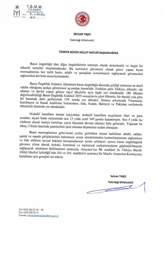 Erkmen açıklamasının devamında, “İYİ Parti olarak gazeteci arkadaşlarımızın mesleklerini yerine getirirken karşılaştığı sorunların farkındayız. Bu kapsamda, İYİ Parti Medya Tanıtım Başkanımız, Tekirdağ Milletvekili Sayın Selcan Taşçı’nın Türkiye Büyük Millet Meclisi’ne sunduğu meclis araştırma komisyonu kurulması teklifi (EK’te sunulmuştur) maalesef AKP ve MHP oylarıyla reddedilmiştir. Bunun takdirini de siz değerli basın mensuplarımıza bırakıyoruz.” dedi.
