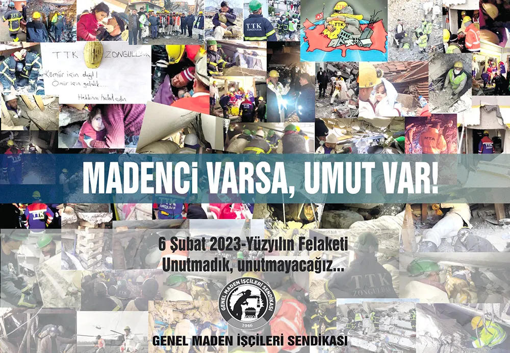 “Ülkemizi derinden sarsan ve 11 ili etkileyen Kahramanmaraş merkezli iki depremin üçüncü yıldönümündeyiz. 6 Şubat 2023 günü, 53 binin üzerinde insanımızı kaybettiğimiz yüzyılın felaketi olarak tarihe geçti. Depremlerde hayatlarını kaybedenlere Allah’tan rahmet ailelerine ve ülkemize bir kez daha başsağlığı diliyoruz. Biz Genel Maden İşçileri Sendikası yöneticileri, Türkiye Taşkömürü Kurumu (TTK) ve Maden Tetkik Arama Kurumu’nda (MTA) çalışan madenciler olarak depremi haber alır almaz deprem bölgesine yardıma koştuk. Arama-kurtarma çalışmalarında büyük bir cesaretle, gösterdikleri üstün gayretlerle, girilemez denilen en riskli enkazlara madencilik tecrübesi ve teknikleriyle girerek yüzlerce cana nefes, milletimize umut olan tüm madencilere bir kez teşekkür ediyoruz. Ülkemizin kahramanları haline gelen değerli madencilerle gurur duyuyoruz. Maden işçilerimizin kahramanlıklarını; kurtarma görüntüleriyle birlikte madencilerin ve depremzedelerin anlatımlarıyla “K-ÖMÜR” belgeselini hazırlayarak tarihe not düştük. Maden işçisi, yeraltında olduğu gibi yerüstünde de ülkemiz için ne kadar önemli olduğunu tekrar tekrar göstermiştir. Biz madenciler, ülkemizin ve milletimizin bize ihtiyacı olduğu her yerde ve her an göreve hazırız. Madenci varsa, umut var. 6 Şubat depremlerinin ardından büyük özverilerle çalışan tüm arama-kurtarma ve yardım ekiplerine, yardım seferberliğine katılarak büyük bir dayanışmanın parçası olan herkese şükranlarımızı sunuyor, teşekkür ediyoruz. Yaşanan acılara tanık olmuş, ortak olmuş maden işçileri olarak ülkemizin bir deprem ülkesi olduğu gerçeğini unutmadan, depreme karşı farkındalık oluşturulması için güçlü çalışmalar yapılması çağrısında bulunuyoruz. Böylesine felaketleri bir daha hiç yaşamamayı diliyor, depremde kaybettiklerimize bir kez daha Allah’tan rahmet diliyoruz. Ülkemizin başı sağ olsun.”