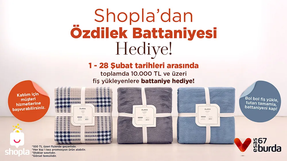 1–28 Şubat 2026 tarihleri arasında geçerli olan ve Shopla mobil uygulamasına özel sunulan Özdilek Battaniye Kampanyası kapsamında; kampanya süresi boyunca Shopla mobil uygulaması üzerinden toplam 10.000 TL ve üzeri fiş yükleyen ziyaretçilere Özdilek marka battaniye hediye ediliyor. Kampanyaya katılım için fişlerin kampanya tarihleri arasında ve alışveriş tarihi itibariyle 7 gün içinde Shopla uygulaması üzerinden yüklenmesi ve her bir fişin en az 100 TL olması gerekiyor. Toplam harcaması 10.000 TL’ye ulaşan kullanıcılar, Shopla uygulamasındaki “Kampanyalarım” bölümünden ilgili kampanyaya giriş yaparak kampanya kodu alabiliyor. Alınan kod, 67 Burda AVM Müşteri Hizmetleri Noktası’nda ibraz edilerek kampanyadan faydalanılabiliyor. Kampanya stoklarla sınırlı olup, her kullanıcı yalnızca bir kez katılım sağlayabiliyor.