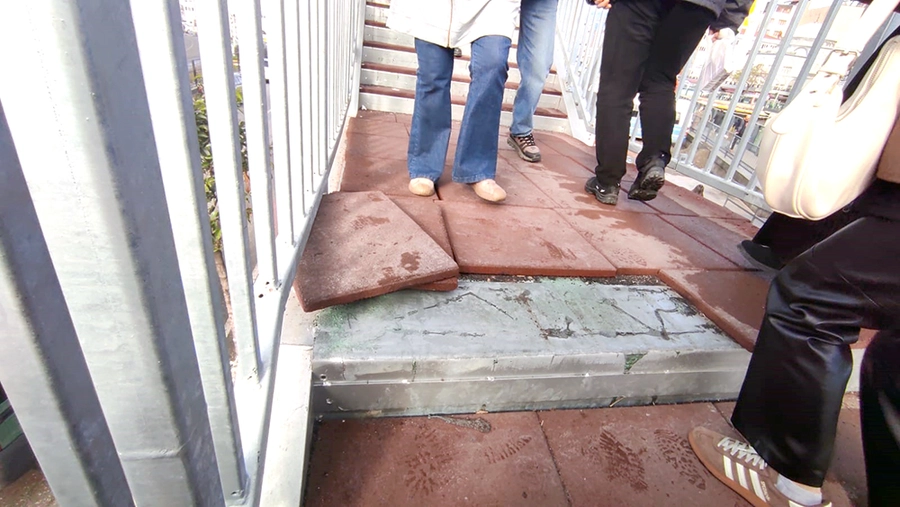 “Bu nasıl işçilik? Zemine döşenen kauçukların çoğu dağıldı. Asansör ya da yaya yolu olmadığı için üst geçidi kullanmak zorunda kalan herkes düşme ve yaralanma riskiyle karşı karşıya” diyen vatandaşlar, üst geçidin acilen ulaşıma kapatılarak güvenli hâle getirilmesini istiyor.