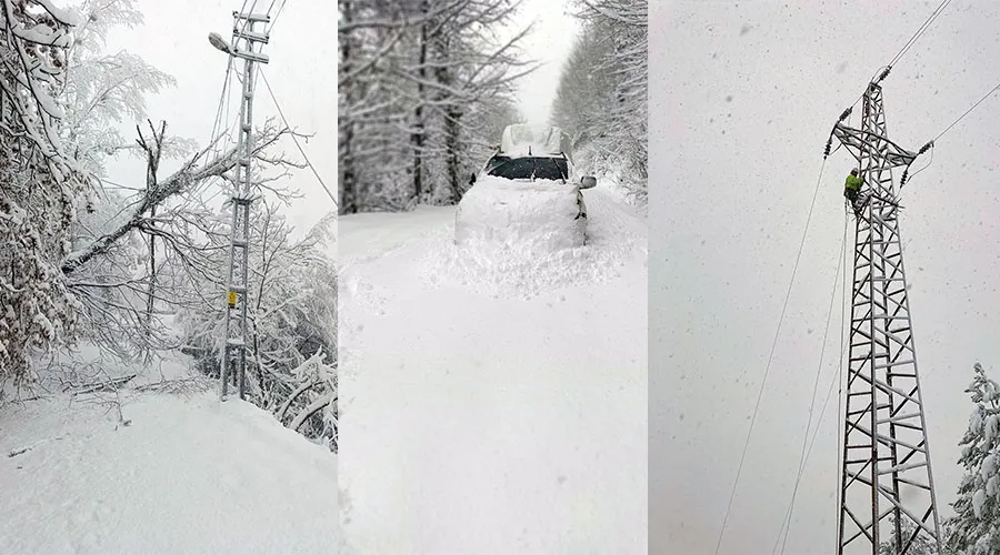 Ormanlık ve yüksek rakımlı alanlarda kar kalınlığının yer yer 1,5 metreyi aşması sahaya erişimi zorlaştırırken; ağaç devrilmeleri, buz yükü ve iletken sarkmaları gibi arızalar yaşanıyor. Araçla ulaşılamayan noktalara yaya olarak ilerleyen ekipler, enerji arzının devamı için yoğun çaba harcıyor. Kritik bölgelerde drone destekli hat kontrolleriyle arızalar hızla tespit edilirken, vinç ve iş makineleri de hazır bekletiliyor.