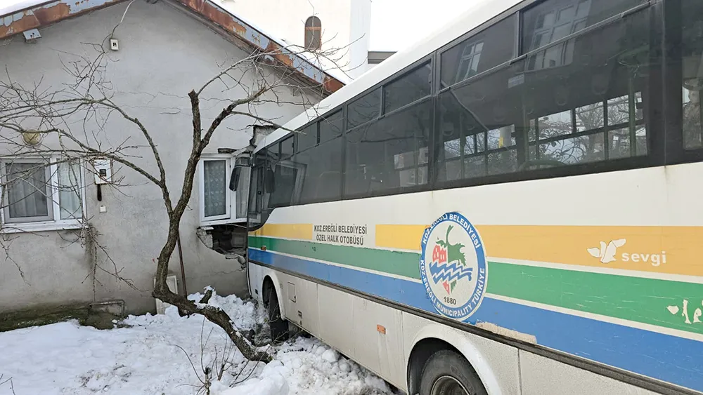 Zonguldak’ın Ereğli ilçesinde sabah saatlerinde etkili olan buzlanma, Kestaneci Mahallesi’nde korku dolu anların yaşanmasına neden oldu. Rampada kontrolden çıkan boş bir halk otobüsü, yol kenarındaki tek katlı eve çarparak durabildi.