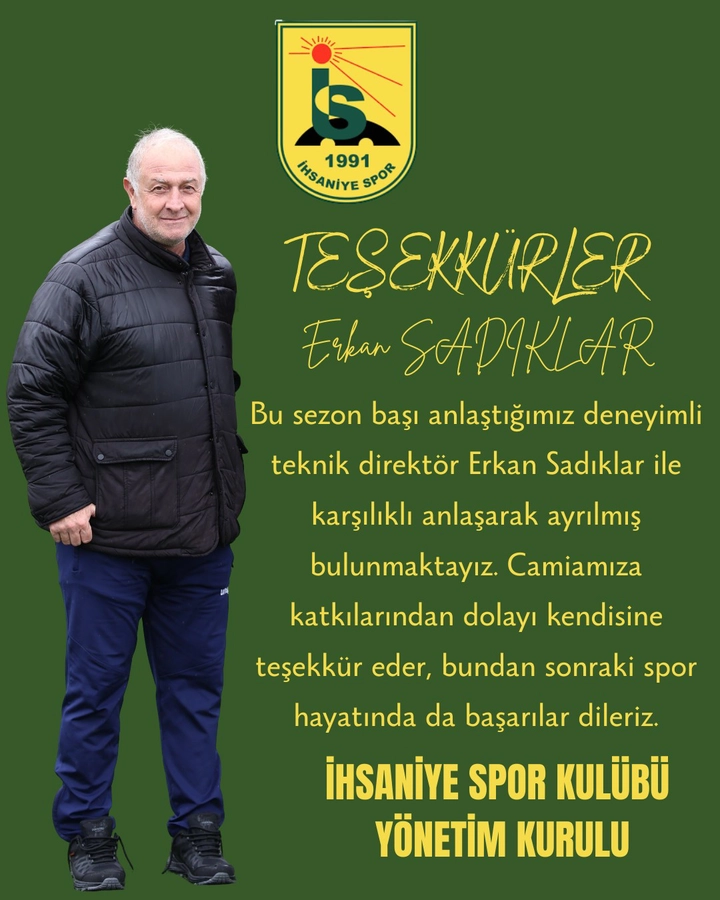 İhsaniye Spor Kulübü’nden yapılan açıklamada; “Bu sezon başı anlaştığımız deneyimli teknik adam Erkan Sadıklar ile karşılıklı anlaşarak ayrılmış bulunmaktayız. Camiamıza katkılarından dolayı kendisine teşekkür eder, bundan sonraki spor hayatında da başarılar dileriz” denildi.
