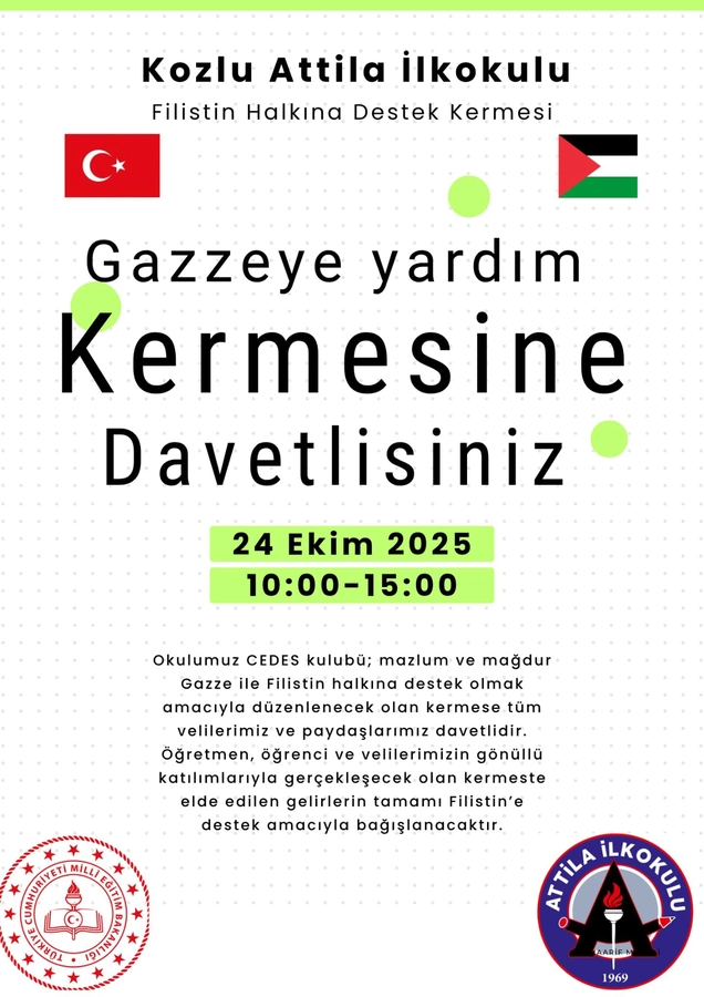 Zonguldak’ın Kozlu ilçesinde eğitim faaliyetlerini sürdüren Attila İlkokulu CEDES (Çevreme Duyarlıyım, Değerlerime Sahip Çıkıyorum) Kulübü, Filistin halkına destek amacıyla örnek bir dayanışma etkinliğine imza atıyor. Okul yönetimi, öğretmenler, öğrenciler ve velilerin gönüllü katkılarıyla hazırlanan “Gazze’ye Yardım Kermesi”, 24 Ekim 2025 Cuma günü saat 10.00–15.00 arasında okul bahçesinde gerçekleştirilecek.
