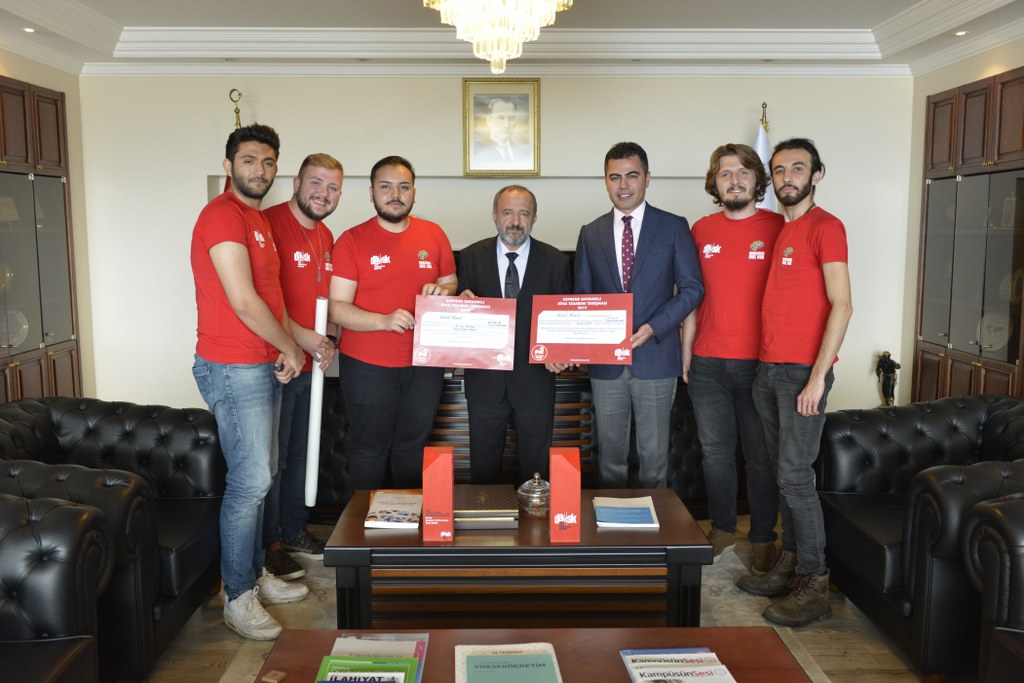 BEÜ Rektörü Prof. Dr. Mustafa Çufalı, Dr. Öğr. Üyesi Memduh Karalar danışmanlığında Kubilay Karaca, Aykan Akgün, Doğuş Aydemir, Eren Başar Yıldız ve Yasin Köroğlu’ndan oluşan takıma teşekkür belgesi verdi.
