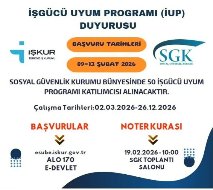 Sosyal Güvenlik Kurumu (SGK) ile Türkiye İş Kurumu (İŞKUR) işbirliğinde düzenlenen İşgücü Uyum Programı (İUP) kapsamında kuruma 50 personel alımı gerçekleştirilecek.