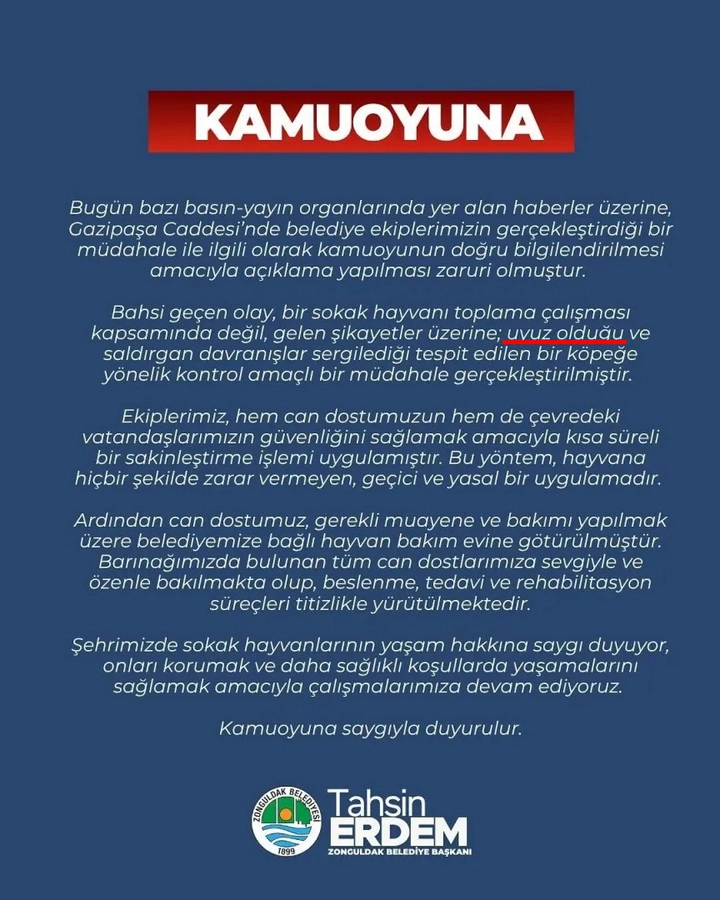 Zonguldak’ın Gazipaşa Caddesi’nde, ekiplerin uyuz olduğu ve saldırgan davranışları gerekçesiyle uyutularak araca bindirilen sokak hayvanıyla ilgili gelen tepkiler üzerine Zonguldak Belediyesi’nden yapılan açıklama bir skandalı daha ortaya çıkardı. Olay anında çekilen video görüntülerde ekiplerin uyuz olduğu iddia edilen sokak hayvanının çıplak elle yine gelişi güzel olarak (koruyucu tedbirler alınmadan) araca konularak olası salgına davetiye çıkarılmasıyla birlikte, ‘İşçi Sağlığı ve İş Güvenliği’ ya da ‘İnsan Sağlığının’ hiçe sayıldığı skandalı gözler önüne serdi.