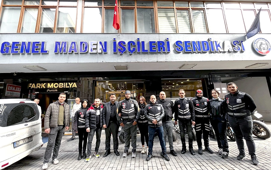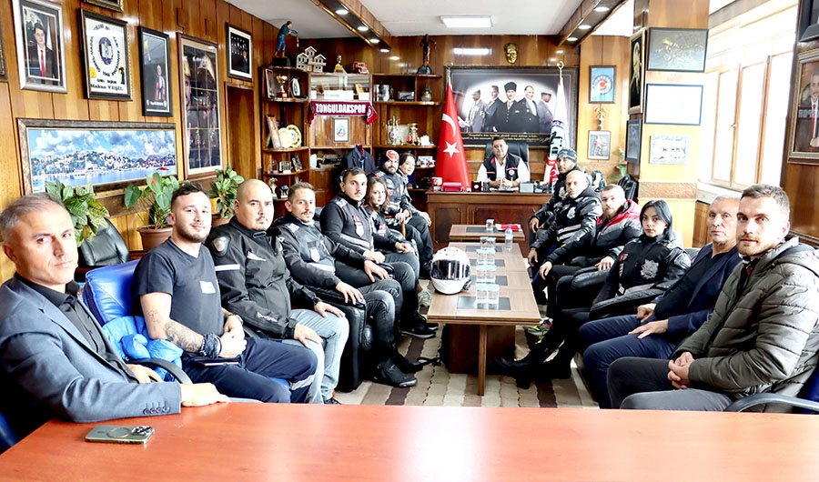 Zonguldak Motosiklet Sürücüleri Derneği (Zonguldak Riders) üyeleri, Genel Maden İşçileri Sendikası (GMİS) Genel Başkanı Hakan Yeşil’i ziyaret ederek Türk bayrağı ile destekleri için plaket takdim etti.