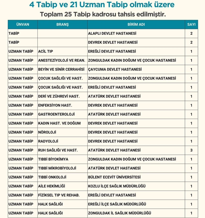 Yapılan açıklamaya göre, Zonguldak’a gönderilecek sağlık personeli arasında 21 uzman tabip ve 4 tabip bulunuyor. Yeni atamalarla birlikte, kentteki sağlık hizmetlerinin daha etkin ve erişilebilir hale gelmesi hedefleniyor.
