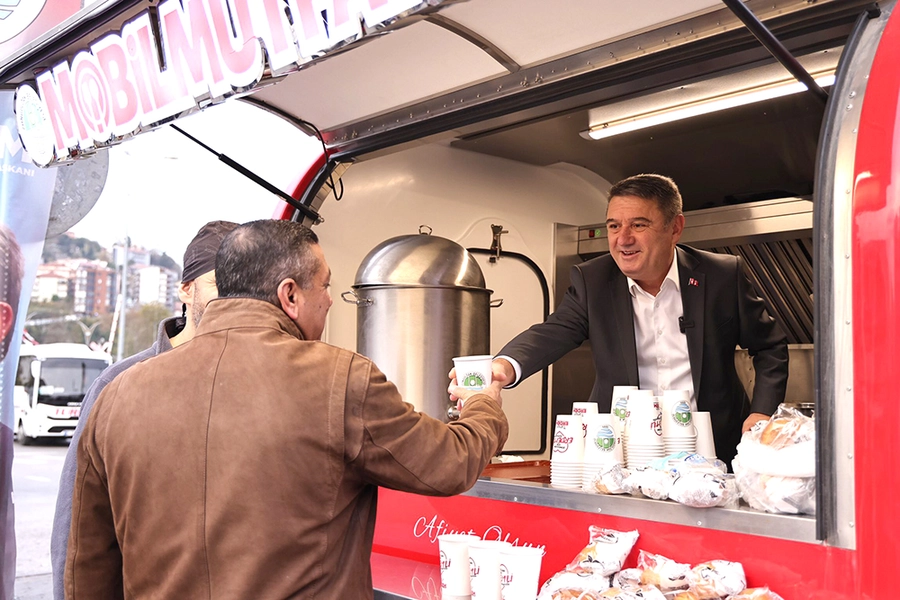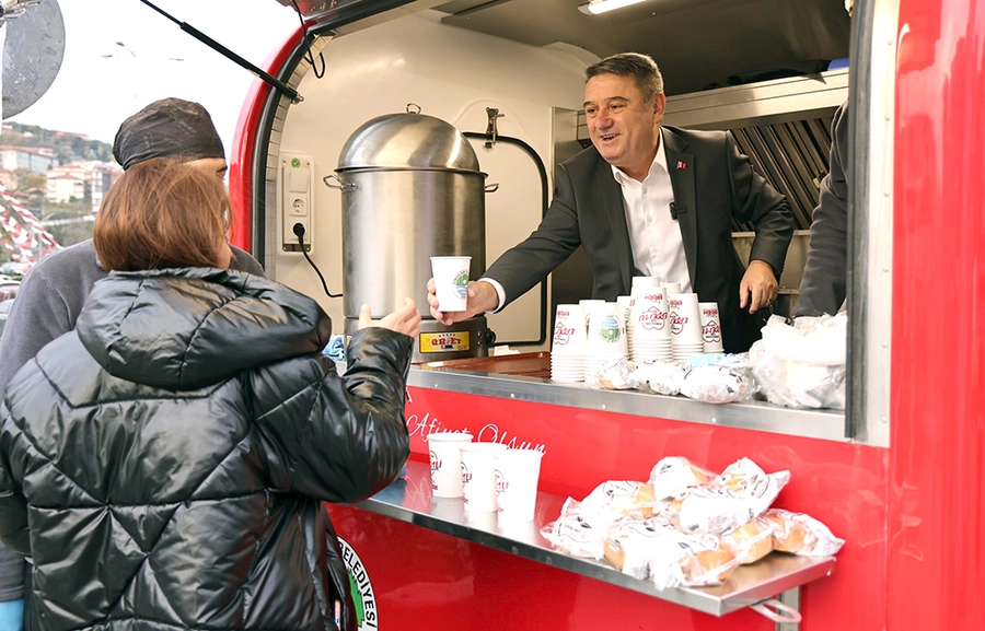 Zonguldak Belediye Başkanı Tahsin Erdem, Kapuz Dolmuş Duraklarında açılan mobil çorba aracından vatandaşlara sabah saat 07.30’da sıcak çorba ikram etti.